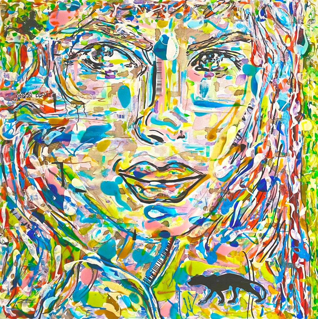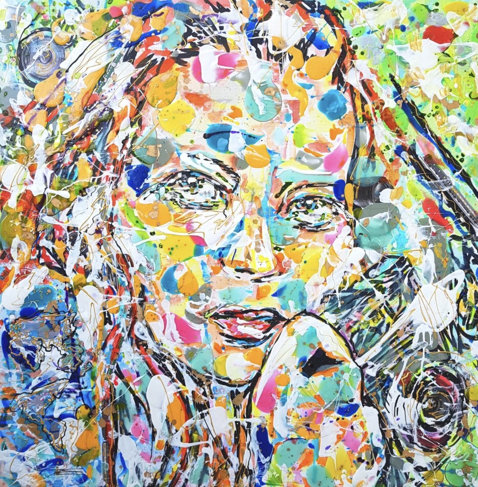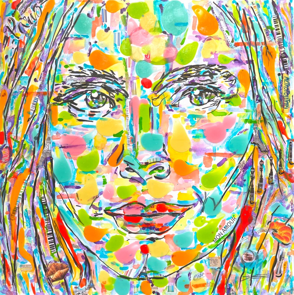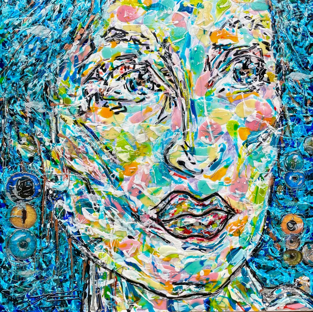 « Sous l’oeil de l’Objectif » symbolise l’Amour de la Photographie sous les traits d’une jeune femme qui vous regarde avec Bienveillance. Est-ce un Top Modèle ? certainement avec ce petit nez charnu bien loin des stéréotypes et ce regard ravageur que sait si bien capter le/la photographe en face d’elle ! Ses yeux ne font qu’un avec l’Objectif. Dans cette oeuvre, j’ai voulu rassembler l’éclat de la Vie et ses Intensités. Avec la résine, j’ai créé une surface où les couleurs vives du fauvisme et les traits de l’expressionnisme s’embrassent, évoquant une présence pleine de Vitalité. Et surtout le Regard de ce visage semble interagir vivement avec celui ou celle qui la contemple.