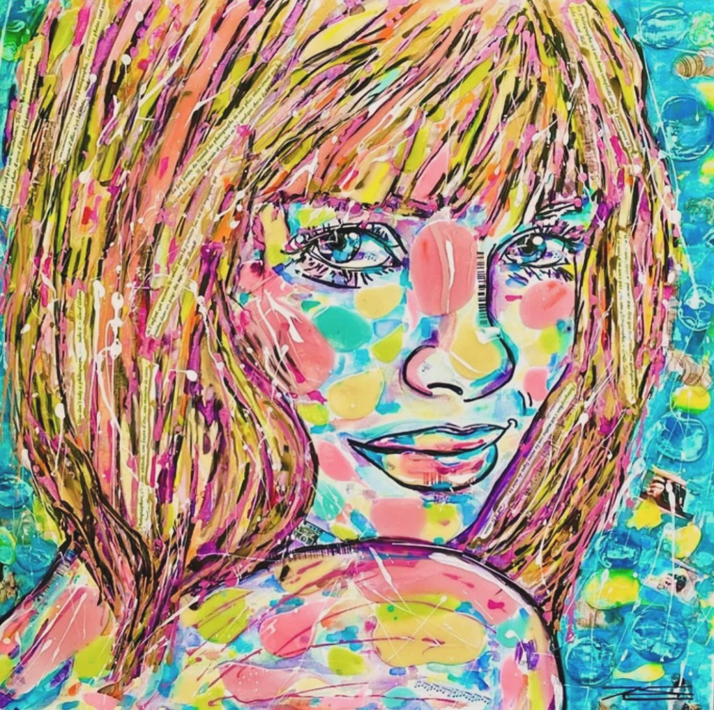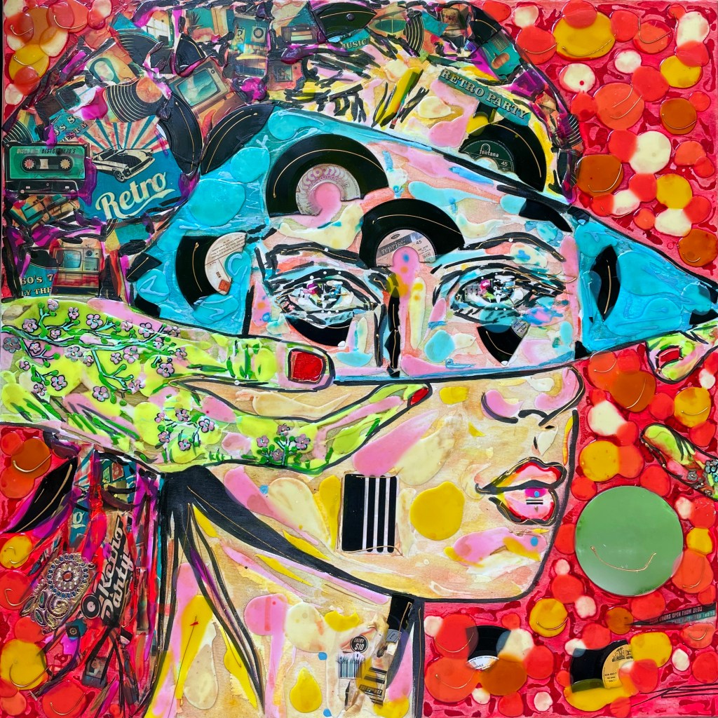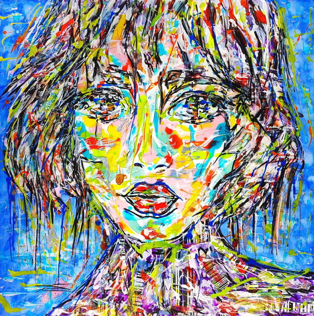 « Sous l’oeil de l’Objectif » symbolise l’Amour de la Photographie sous les traits d’une jeune femme qui vous regarde avec Bienveillance. Est-ce un Top Modèle ? certainement avec ce petit nez charnu bien loin des stéréotypes et ce regard ravageur que sait si bien capter le/la photographe en face d’elle ! Ses yeux ne font qu’un avec l’Objectif. Dans cette oeuvre, j’ai voulu rassembler l’éclat de la Vie et ses Intensités. Avec la résine, j’ai créé une surface où les couleurs vives du fauvisme et les traits de l’expressionnisme s’embrassent, évoquant une présence pleine de Vitalité. Et surtout le Regard de ce visage semble interagir vivement avec celui ou celle qui la contemple.