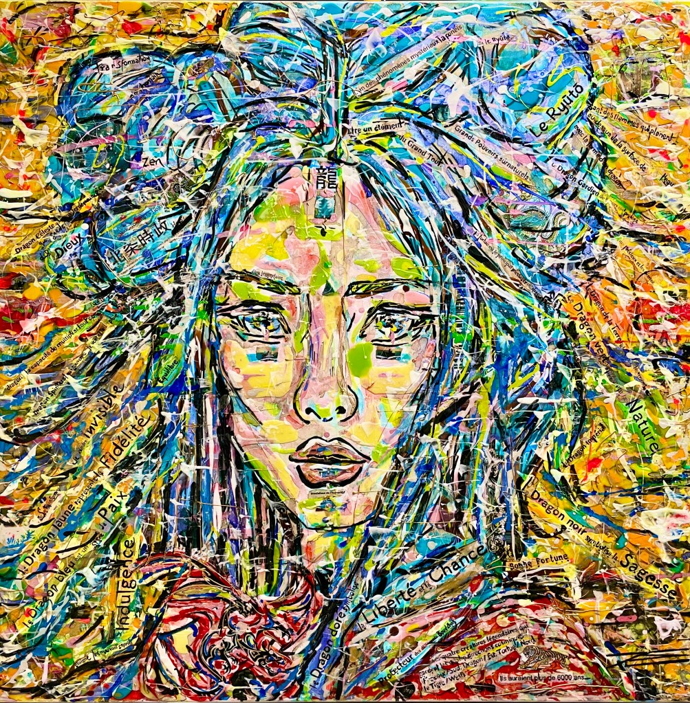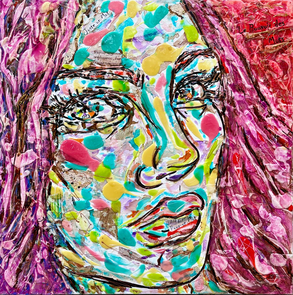 Dans ce tableau, la littérature et le langage sont présents avec des signes distinctifs intégrés comme « Jeu de mots », « Pour un Mot », « Juste un Mot » et « Le pouvoir des Mots » mais également les extraits de textes au langage divers. Des fenêtres sont associées aux yeux pour revendiquer une ouverture d’esprit sur le monde et les langages. Le rose des cheveux nomme le « sans complexe » et « ceci est mon choix ». Le fond Rouge représente la puissance du « Pouvoir des Mots ». Le regard est affirmé pour aller très loin et ne garder que les Bons Mots.