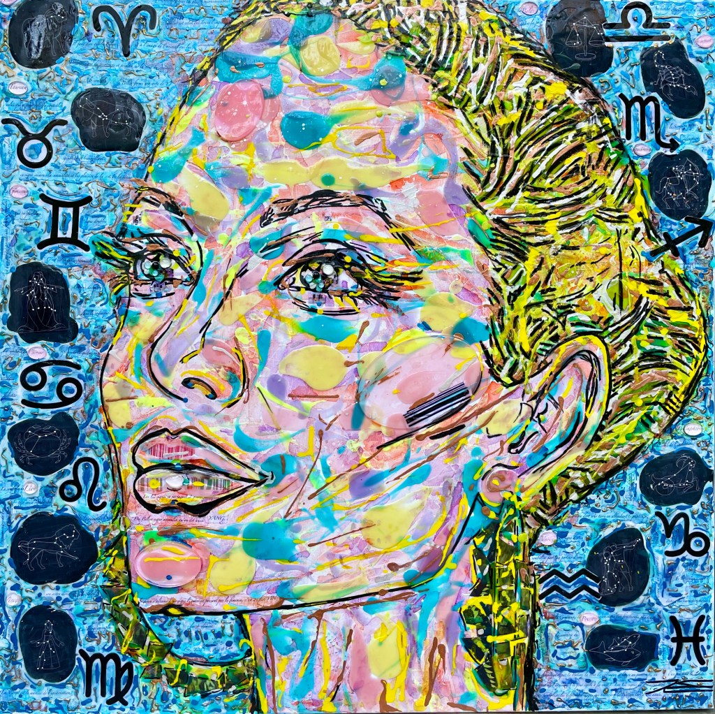 « Zodiac » prend les traits de l’actrice Angélina Jolie, le regard ascendant pour lire les étoiles. Le thème de ce tableau est le zodiaque. Les douze signes astrologiques sont représentés en arrière-plan par la représentation des signes et des écrits caractéristiques à chacun (Le Bélier, Le Taureau, Le Gémeaux, Le Cancer, Le Lion, La Vierge, La Balance, Le Scorpion, Le Sagittaire, Le Capricorne, Le Verseau, Les Poissons). La constellation du zodiaque est présente avec la forme astrale de tous les signes astrologiques (les formes sombres dans l’espace avec les astres et points lumineux caractéristiques de chaque signe à une période précise de l’année). Le mouvement des planètes est exprimé par les tracés dans la chevelure et les boucles d’oreilles créées avec des cartes images animées. Deux sortes de résine sont inclues dans ce tableau, pour créer plus de reliefs notamment pour les yeux, les pommettes et le menton. Un petit tour au-dessus et bien au-delà des nuages, cela vous tente ?