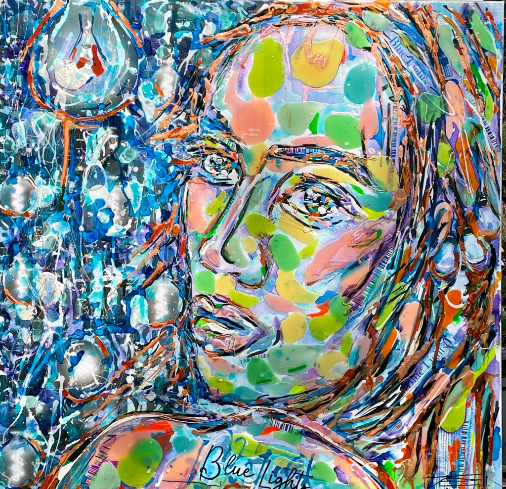 « Blue Lights » a pour thème la lumière bleue et prend les traits d’une jolie femme eurasienne aux grands yeux et à la longue chevelure. La lumière bleue est partout autour de nous et est la part visible du spectre lumineux. Ce tableau a été créé en novembre 2022, en France, c’est une période où la nuit arrive plus vite vers 17h. L’obscurité étant plus présente, les éclairages prennent la relève d’où la présence d’ampoules réalisés pour le fond bleu nuit du tableau, par endroit bleu métallisé. Le visage comprend des éléments phosphorescents et fluorescentes alliés à la résine, ce qui lui donne un effet surnaturel. Quelques mèches cuivrées et énergiques prennent leurs envols. « Blue Lights » vous regarde de côté au-dessus de son épaule, l’air de vous souhaiter une bonne nuit.