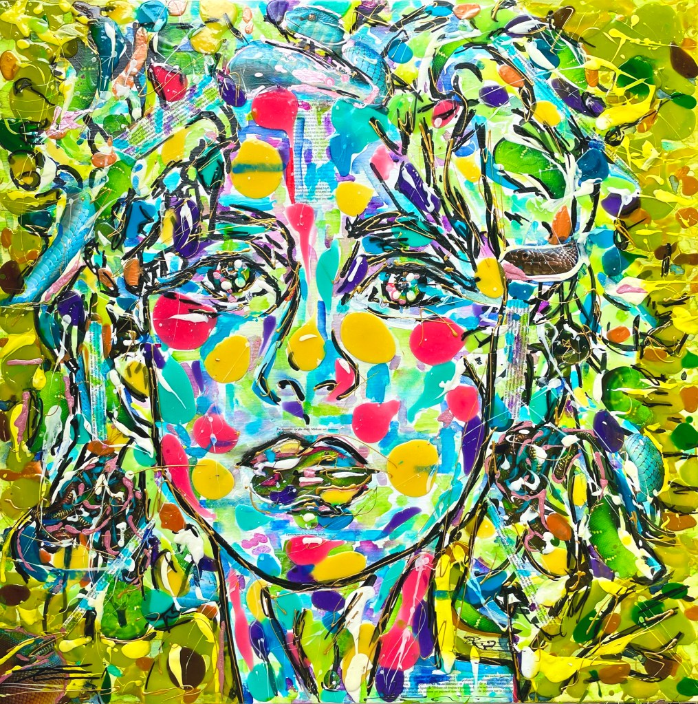 « Médusa médusée » prend les traits de cette gorgone avec les serpents présents dans ce tableau mais pas que dans la chevelure ! Également sur la bouche, le cou et dans les yeux où l’on peut voir un œil de serpent. Les textes intégrés racontent son histoire avec une conclusion qui couronne sa bouche. Elle semble stupéfiée… le sort d’Athéna serait-il obsolète ?