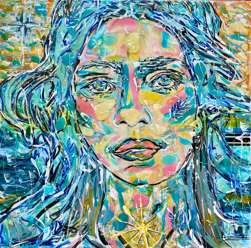 Elle prend la forme d’une navigatrice. Je la vois cheveux aux vents sur son bateau le regard au loin, et qui s’oriente vers une voie bien tracée. La rose des vents l’accompagne dans son périple comme un symbole porte-bonheur qui l’aide à trouver la bonne direction et l’espoir pour y parvenir.