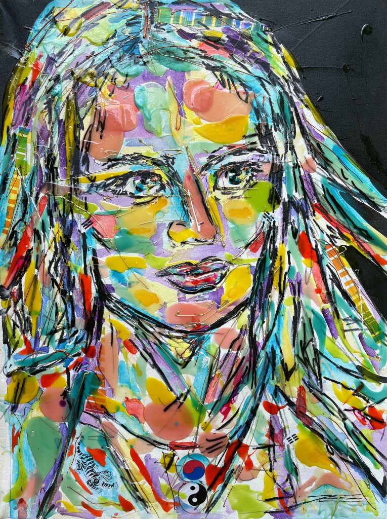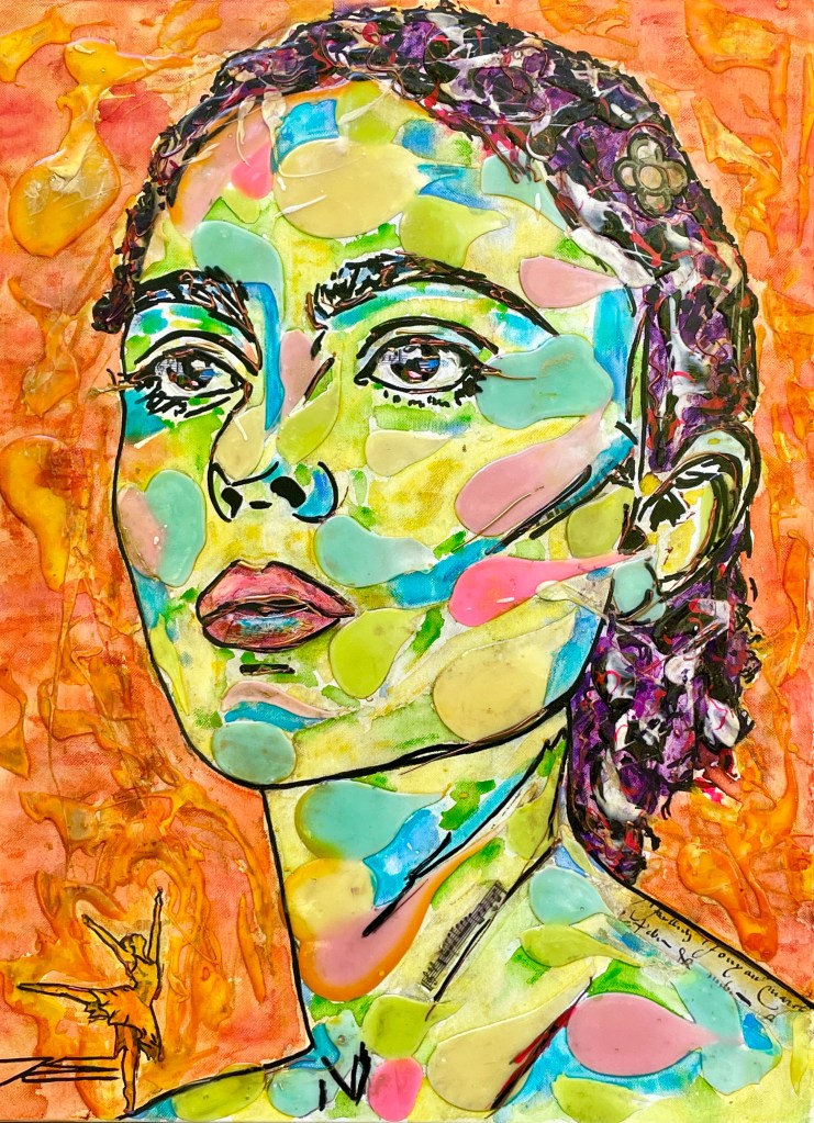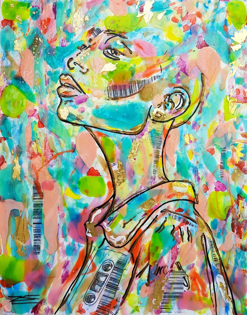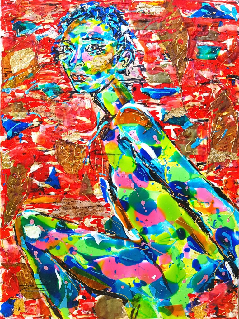 La couleur rouge, parsemée de feuilles d’or et d’écrits, représente l’énergie indémontable. Le regard de face et le corps de mi-côté représentent le chemin parcouru et l’avenir. Un ensemble de symboles se regroupent dans ce tableau de style Pop Art.