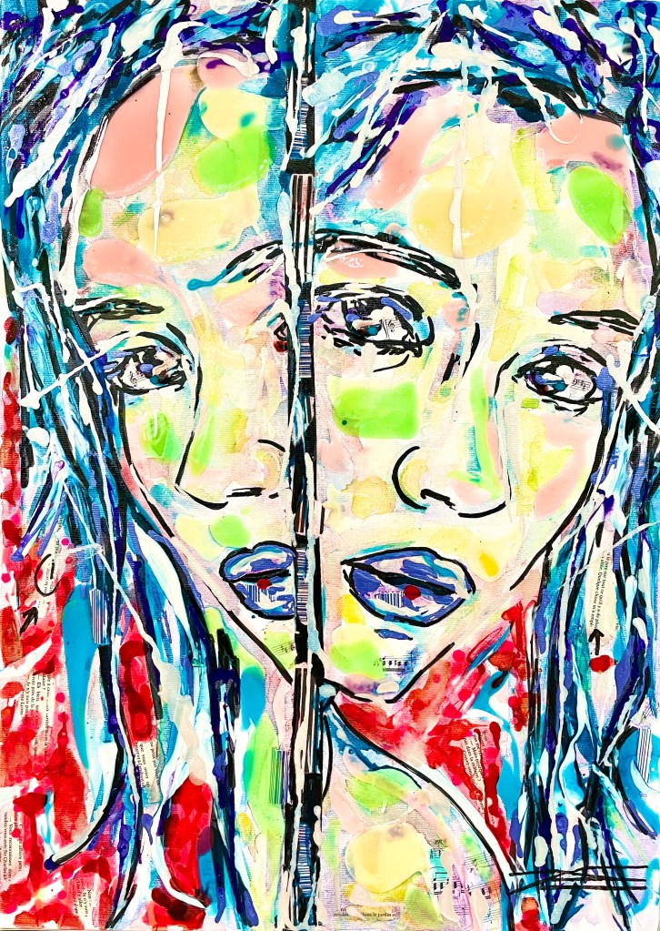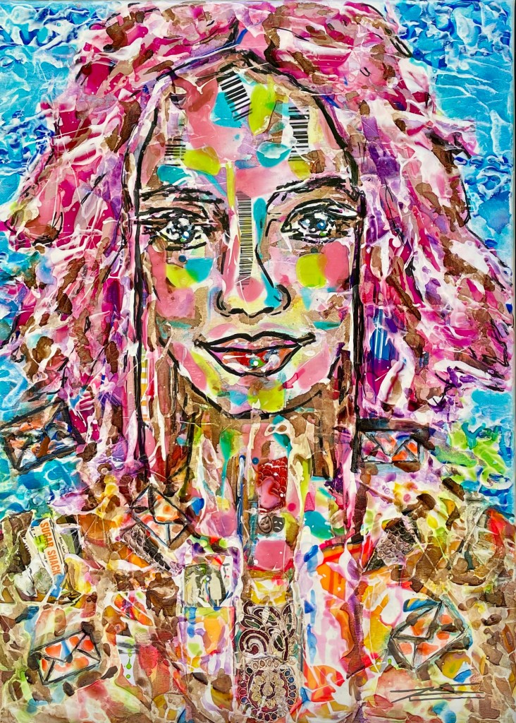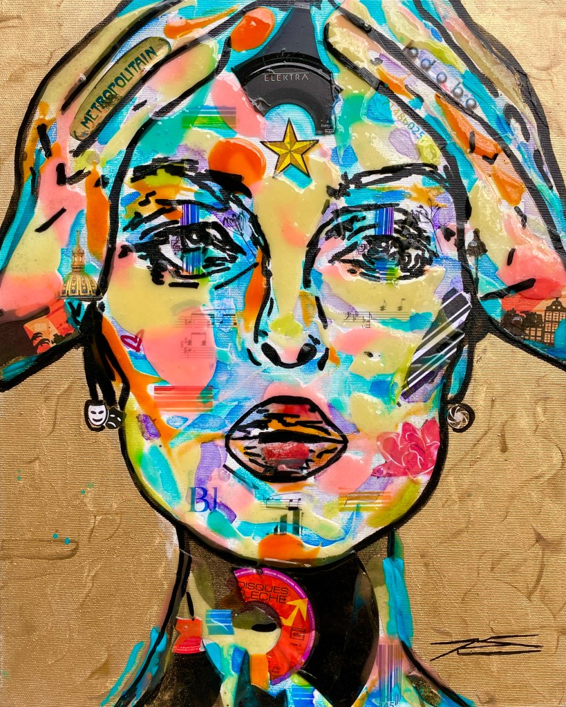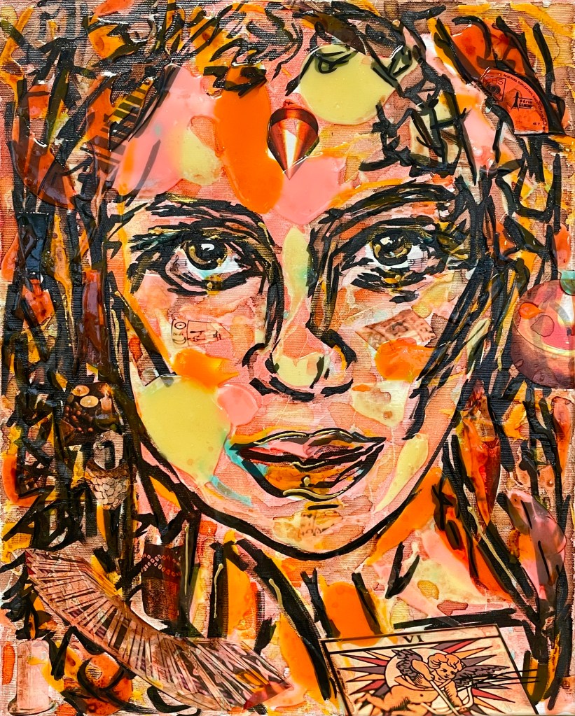 La couleur rouge, parsemée de feuilles d’or et d’écrits, représente l’énergie indémontable. Le regard de face et le corps de mi-côté représentent le chemin parcouru et l’avenir. Un ensemble de symboles se regroupent dans ce tableau de style Pop Art.