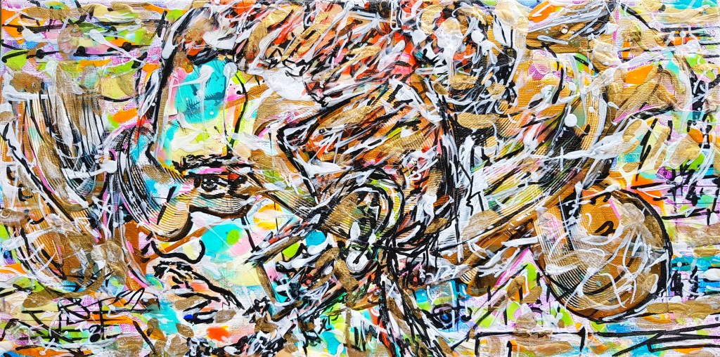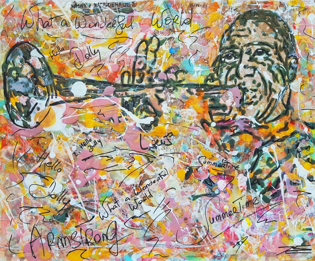 Le tableau « Armstrong » représente Louis Armstrong, l’ambiance et la légende du jazz. Louis Armstrong est un musicien de jazz. et chanteur. D’une musique de folklore afro-américaine initialement enracinée dans le gospel et le blues traditionnel, Armstrong a fait un courant musical national populaire à vocation universelle. Son talent de trompettiste, son charisme, ses qualités d’homme de scène et sa personnalité généreuse ont forgé au fil du temps sa renommée internationale.