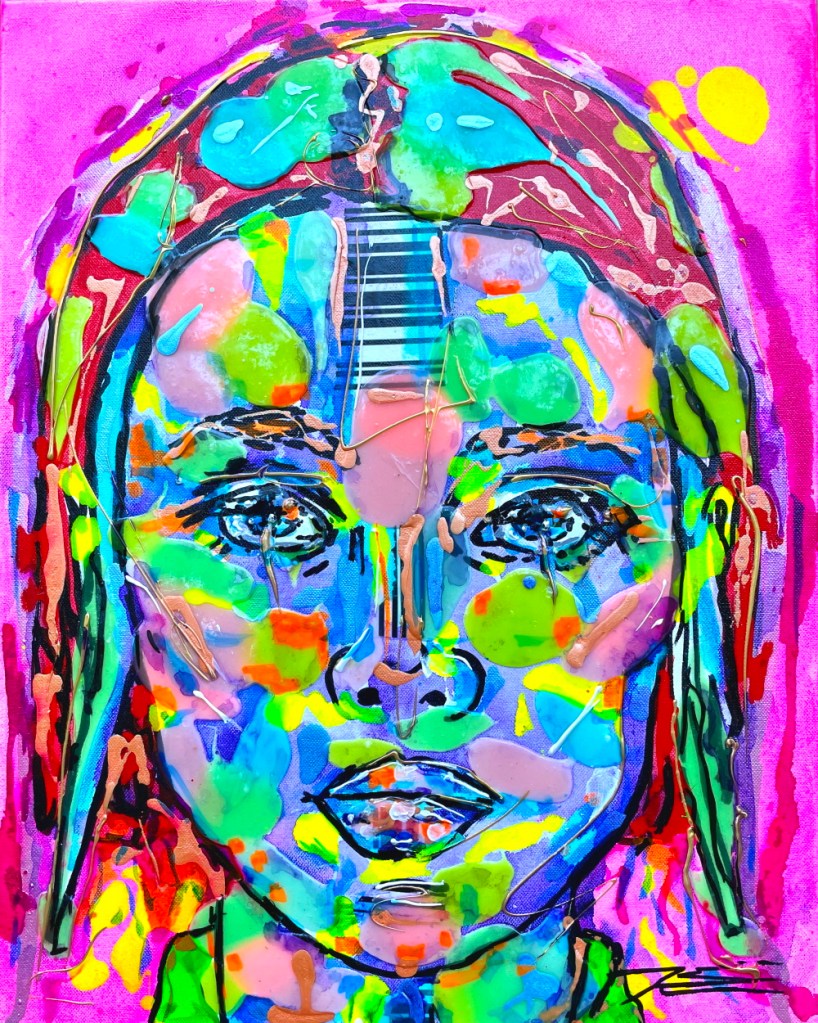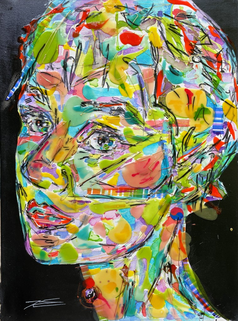 Ce tableau est né d’une écoute des oeuvres de Miles Davis, Jazz Man renommé et dont le faciès expressif m’a inspiré. Ses grands yeux sont puissants de part ce regard volontaire et visionnaire musicalement.
