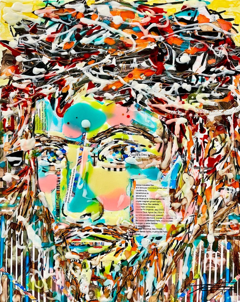 Ce tableau a été créé en décembre 2022. Il est peint en grande partie avec de la résine. Des textes en français et en latin y figurent, ainsi que des photos représentant son image terrestre. La couronne d’épines se compose de morceau de disques vinyle. Joyeux Noël.
