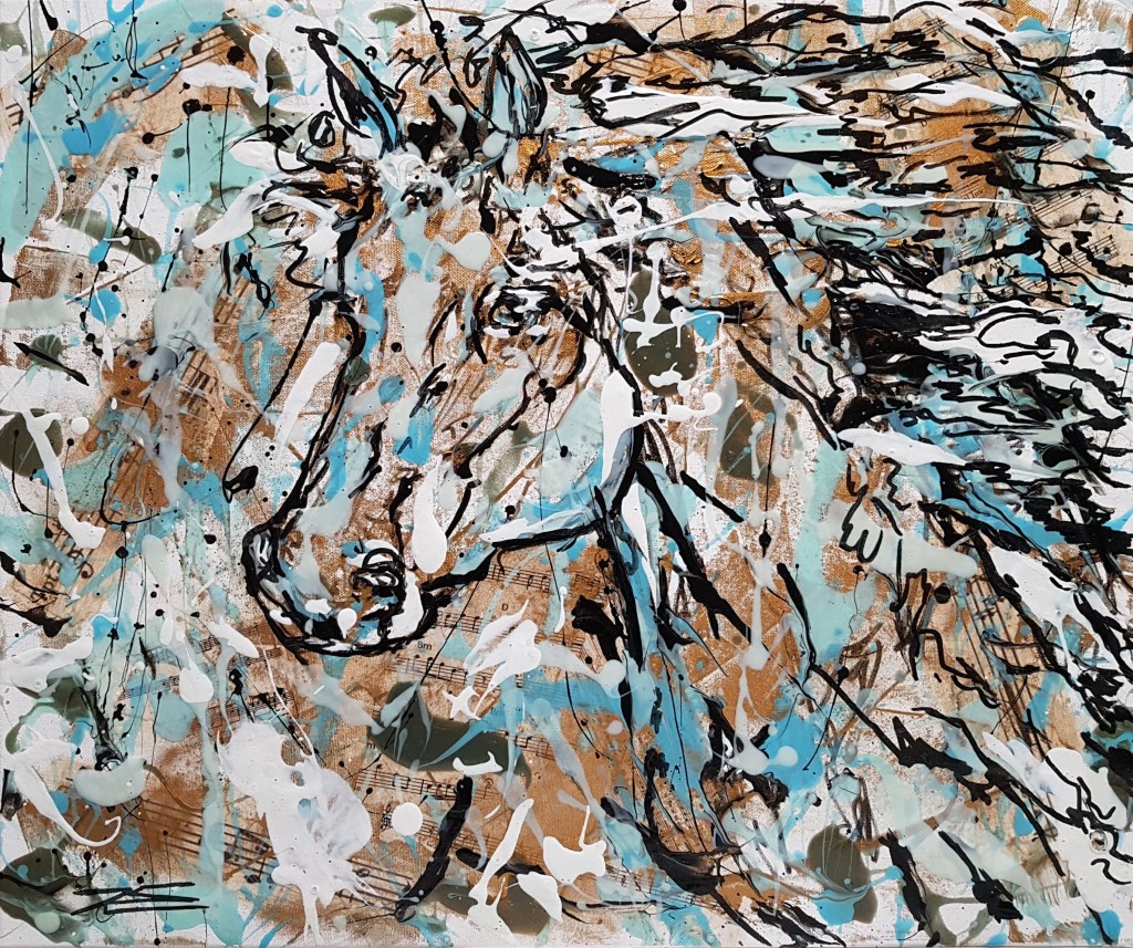 Le tableau « Indomptable » représente un cheval au galop. Il est symbolisé par la volonté de liberté et la vitesse. Il veut aller vite et arriver à son but. Rien ni personne ne le fera céder. Ce cheval représente la force qui est en nous qui ne peut pas être domptée.